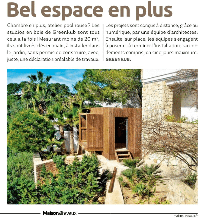 Dans son numéro 299, Maison&Travaux met en avant la facilité des démarches dont les clients Greenkub bénéficient. En effet, le prix d’un studio de jardin Greenkub inclut :