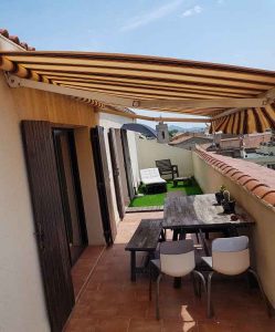 La terrasse tropézienne est protégée du vent grâce à sa situation en hauteur, elle constitue un lieu idéal pour diverses activités telles que les repas en plein air, les moments de détente, ou simplement pour profiter de l’air frais et de la vue, tout en conservant une certaine intimité loin des regards indiscrets.