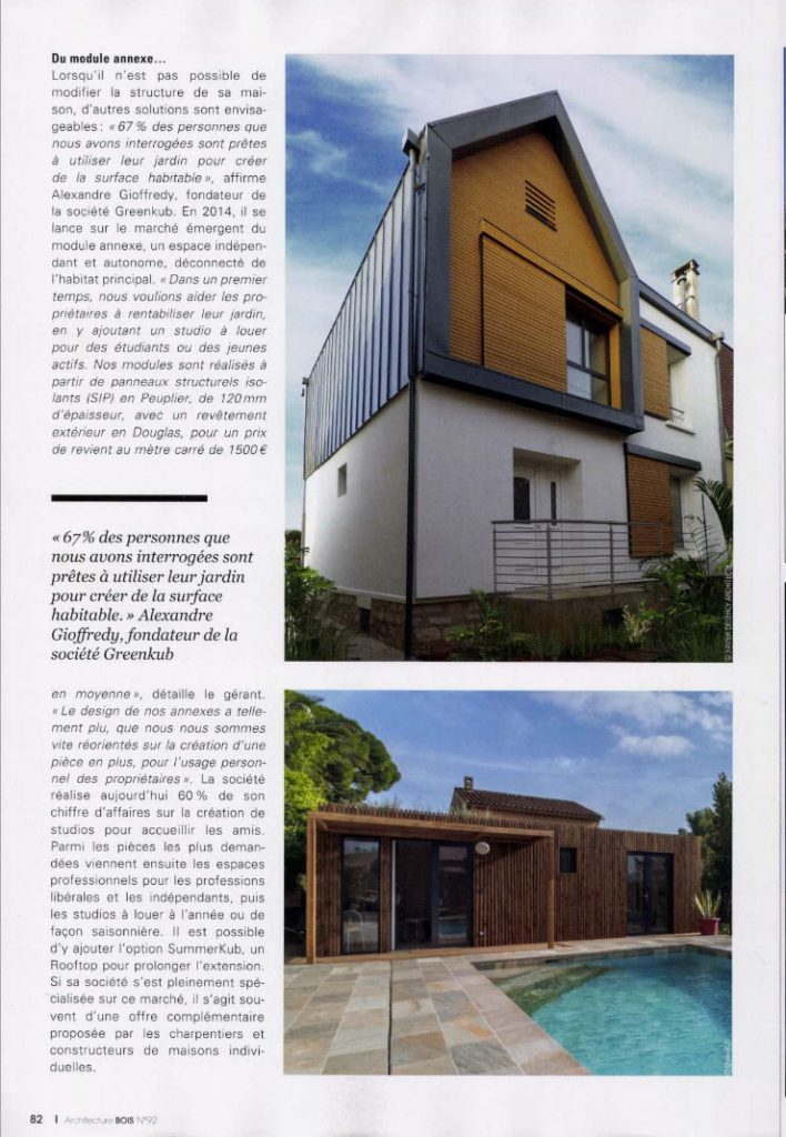 Dans un premier temps, nous voulions aider les propriétaires à rentabiliser leur jardin, en y ajoutant un studio à louer pour les étudiants ou les jeunes actifs. Nos modules sont réalisés à partir de panneaux structurels isolants (SIP) en Peuplier, de 120mm d’épaisseur, avec un revêtement extérieur en Douglas, pour un prix de revient au mètre carré de 1500€ en moyenne. – Alexandre Gioffredy